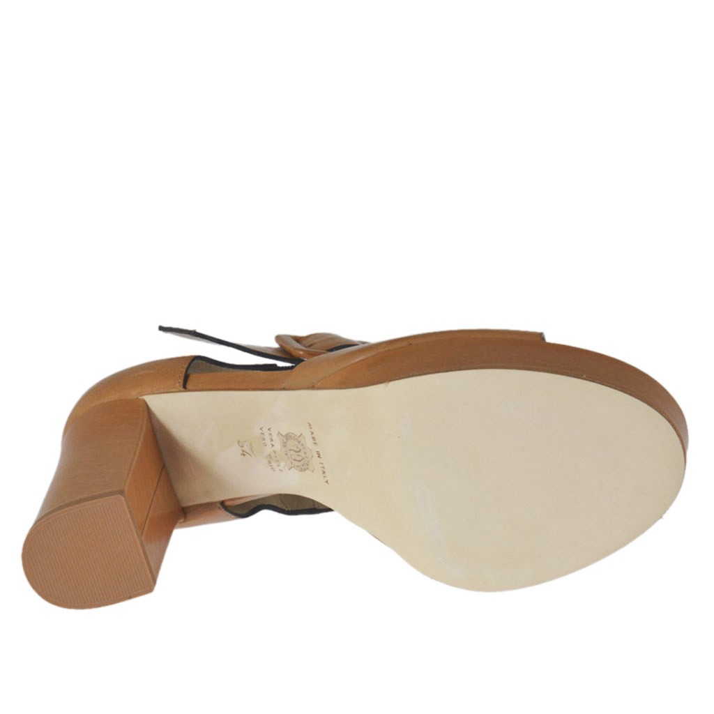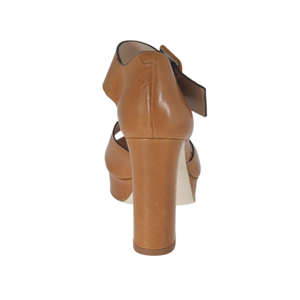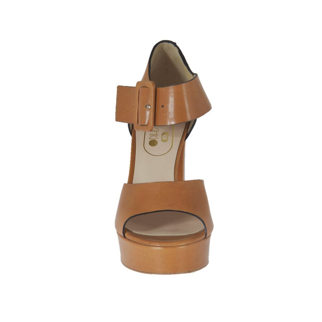 Zapato abierto para mujer con hebilla, altura tacon 9cm con 2cm de plataforma, en piel brun claro, fondo en cuero, forro en piel. Disponible en las tallas pequeñas y grandes.