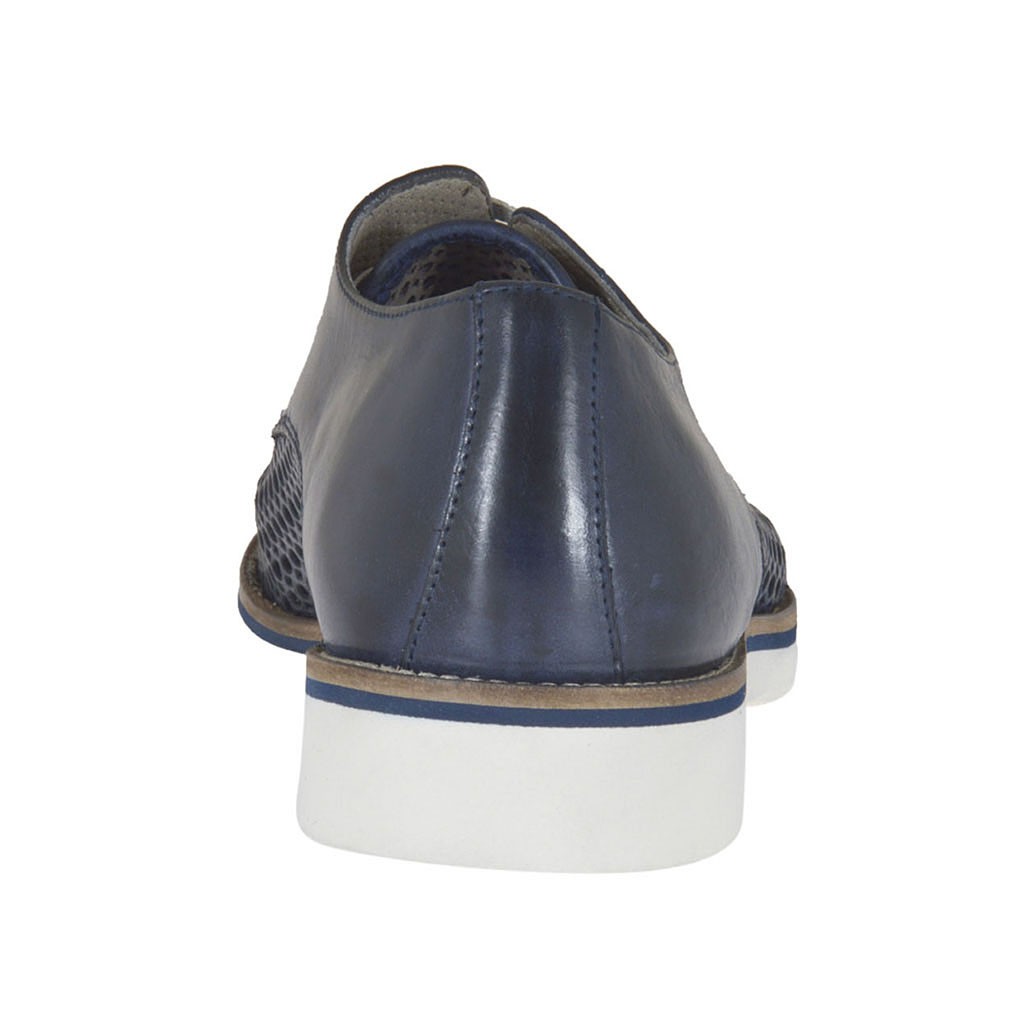 Zapato con cordones para hombre, en piel perforada de color azul, fondo en goma, forro en piel.