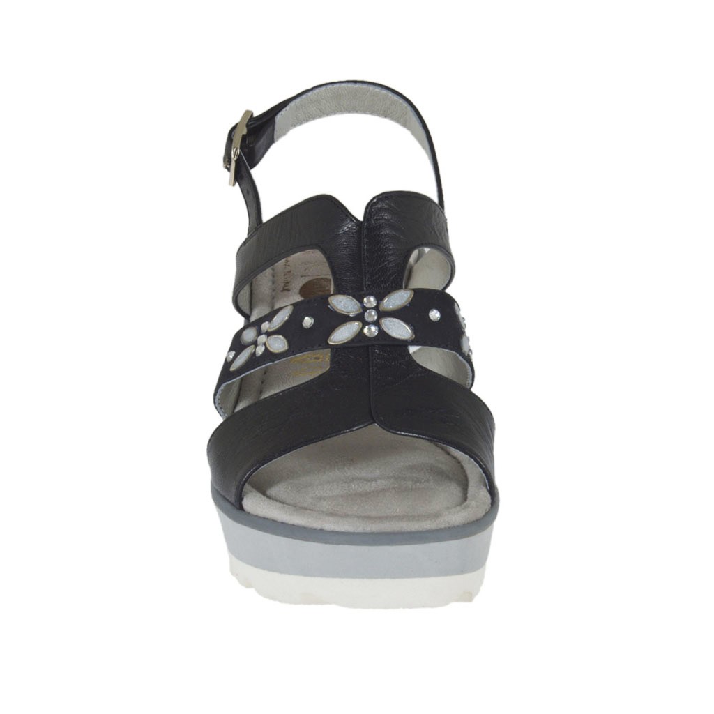 Sandale pour femmes avec strass, 6 cm. haut talon compensé et 2 cm. haut plateforme, en cuir et nubuck noir, semelle en caoutchouc, doublure en cuir. Disponible dans les petites et grandes pointures.