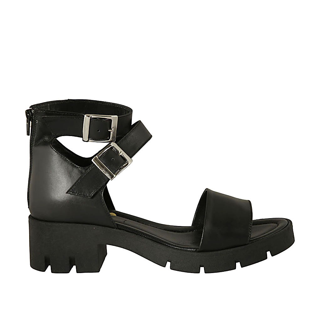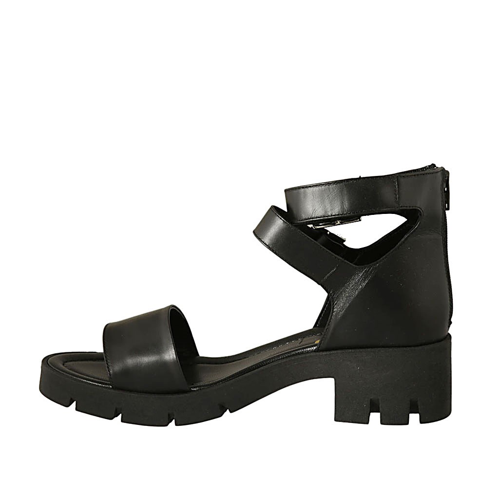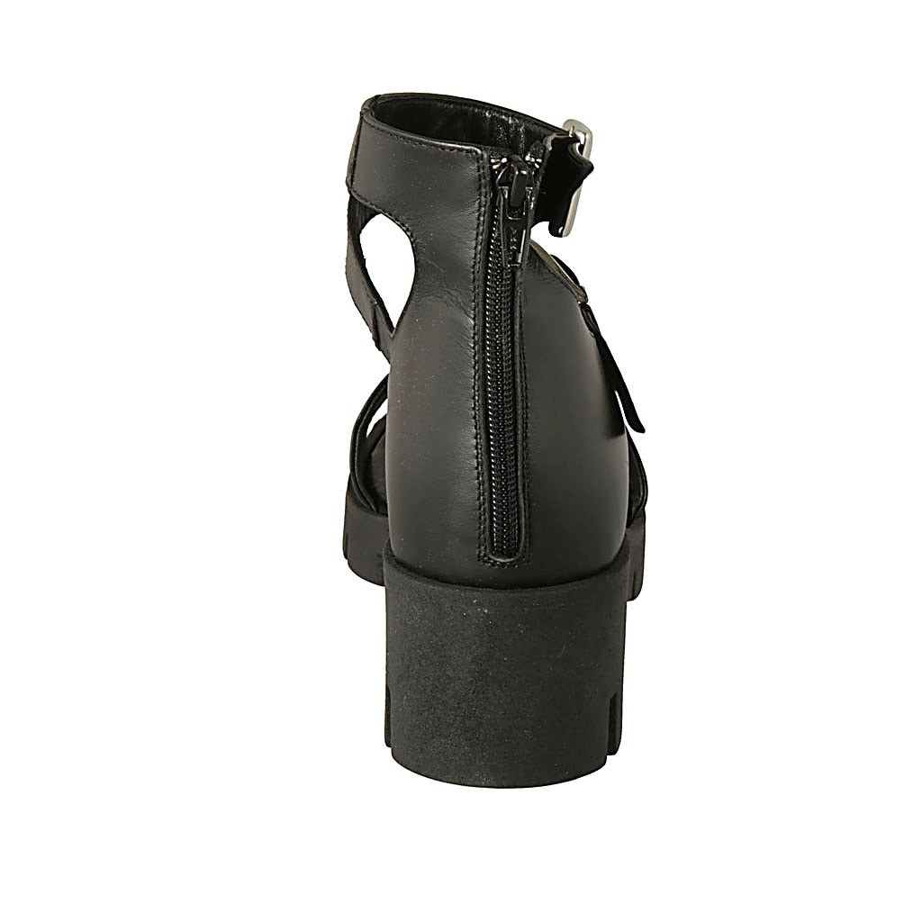 Chaussure ouverte pour femmes avec fermeture éclair et boucles en cuir noir talon 5