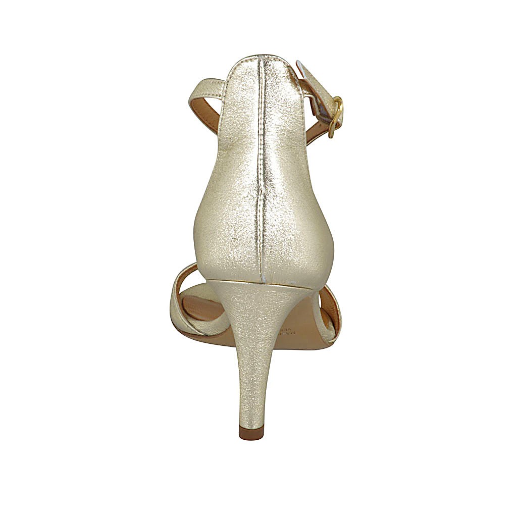 Chaussure ouverte pour femmes avec courroie en cuir lamé platine talon 7