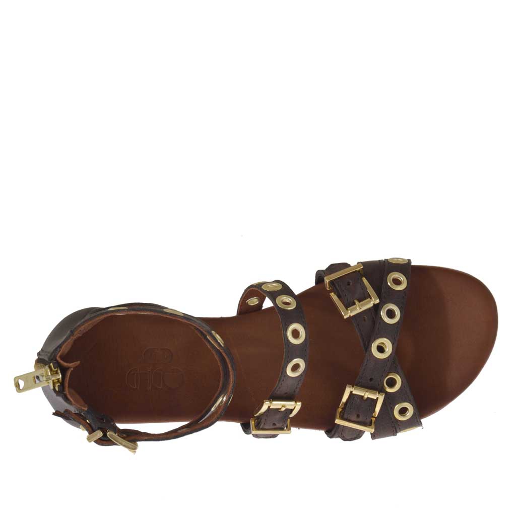 Chaussure ouvert pour femmes avec fermeture éclair, courroies, boucles et goujons or, 1 cm. haut talon, en cuir brun foncé, semelle en cuir, doublure en cuir. Disponible dans les petites et grandes tailles.
