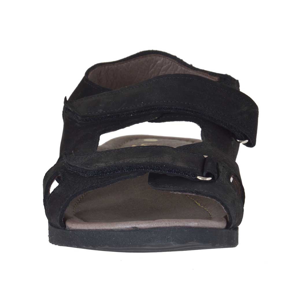 Sandale pour hommes avec deux bandes de fermeture velcro, en nubuck noir, semelle en caoutchouc, doublure en cuir. Disponible dans les tailles grandes.