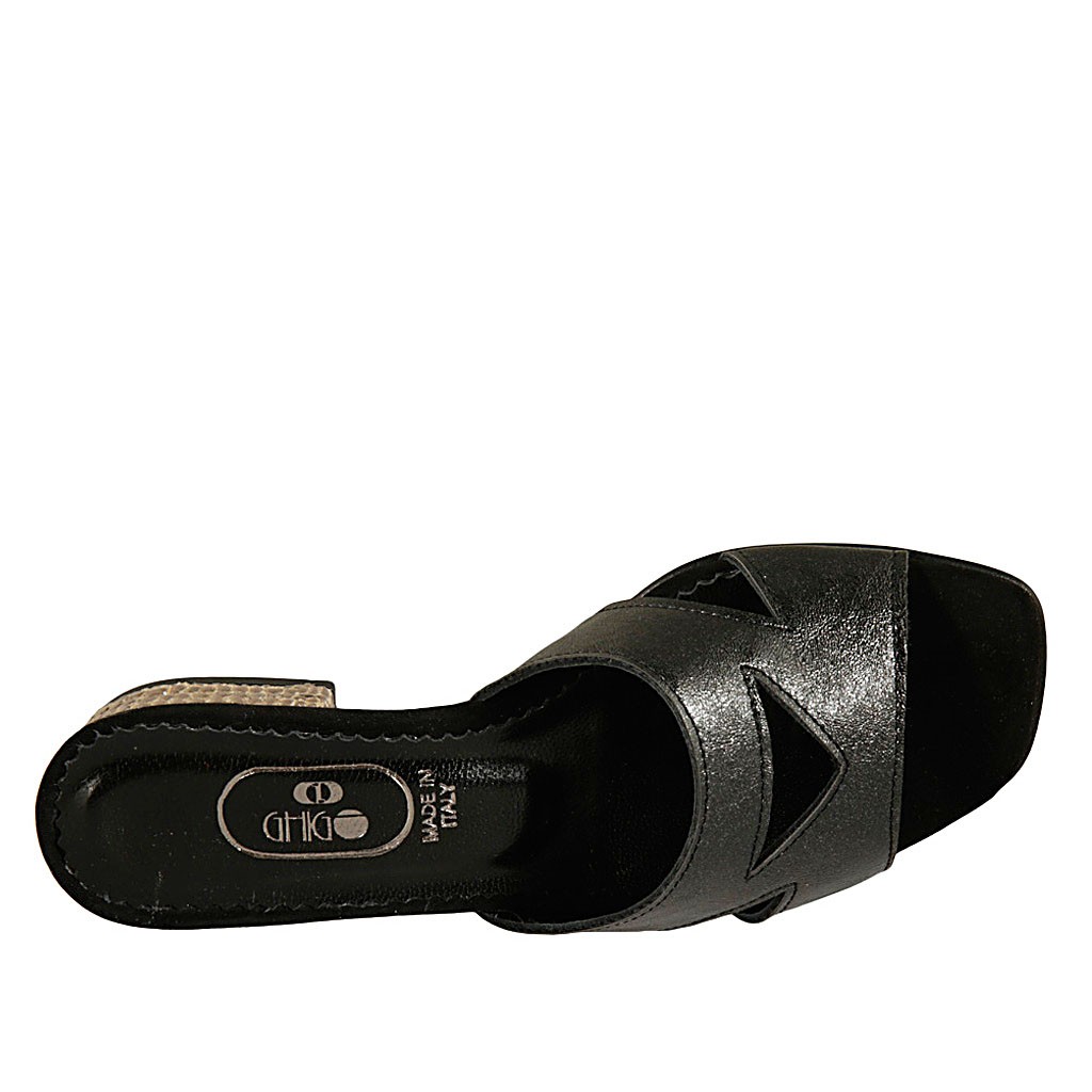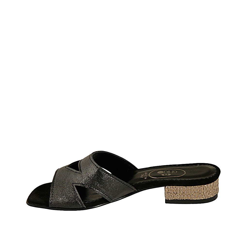 Mule ouvert pour femmes en cuir lamé noir et tissu beige platine talon 2