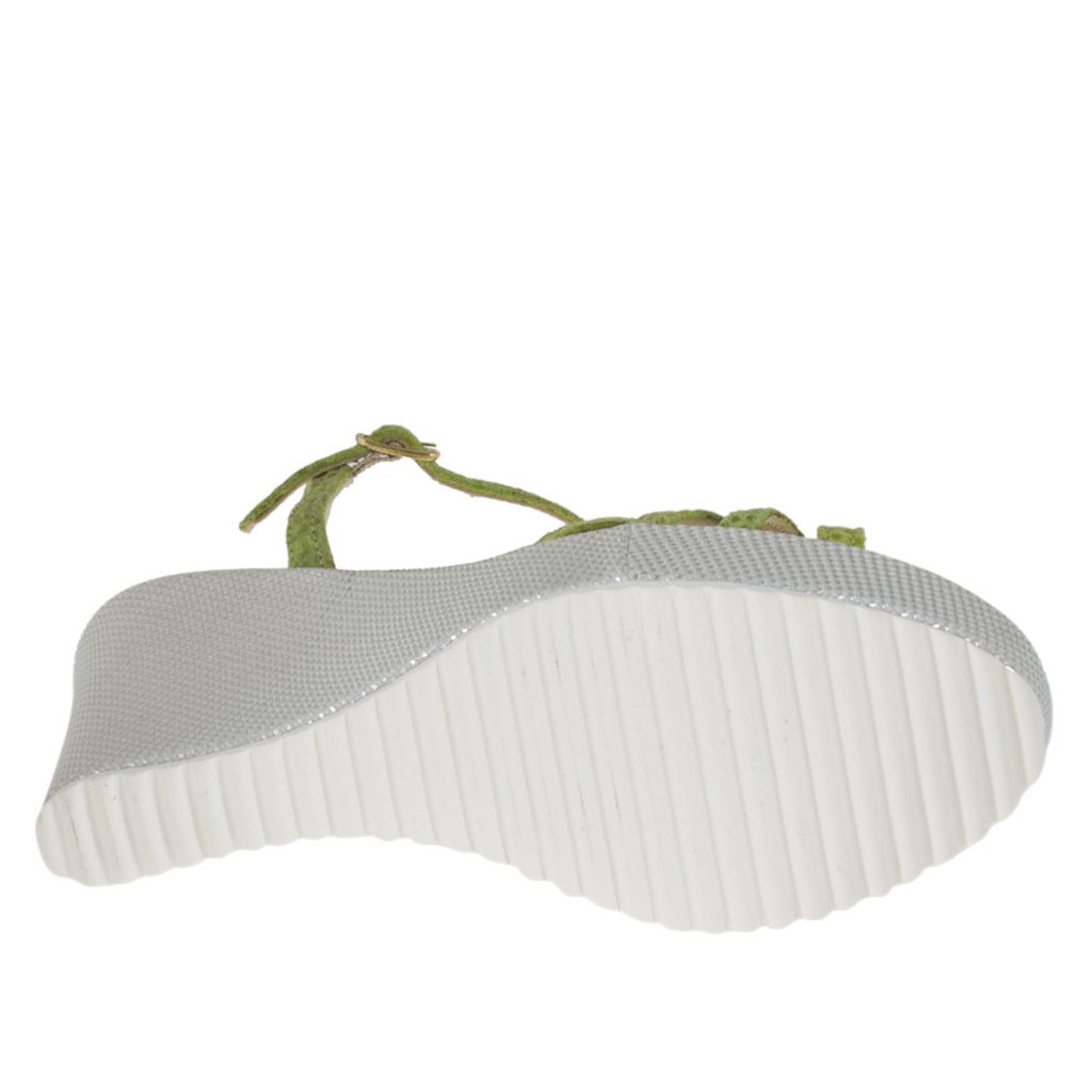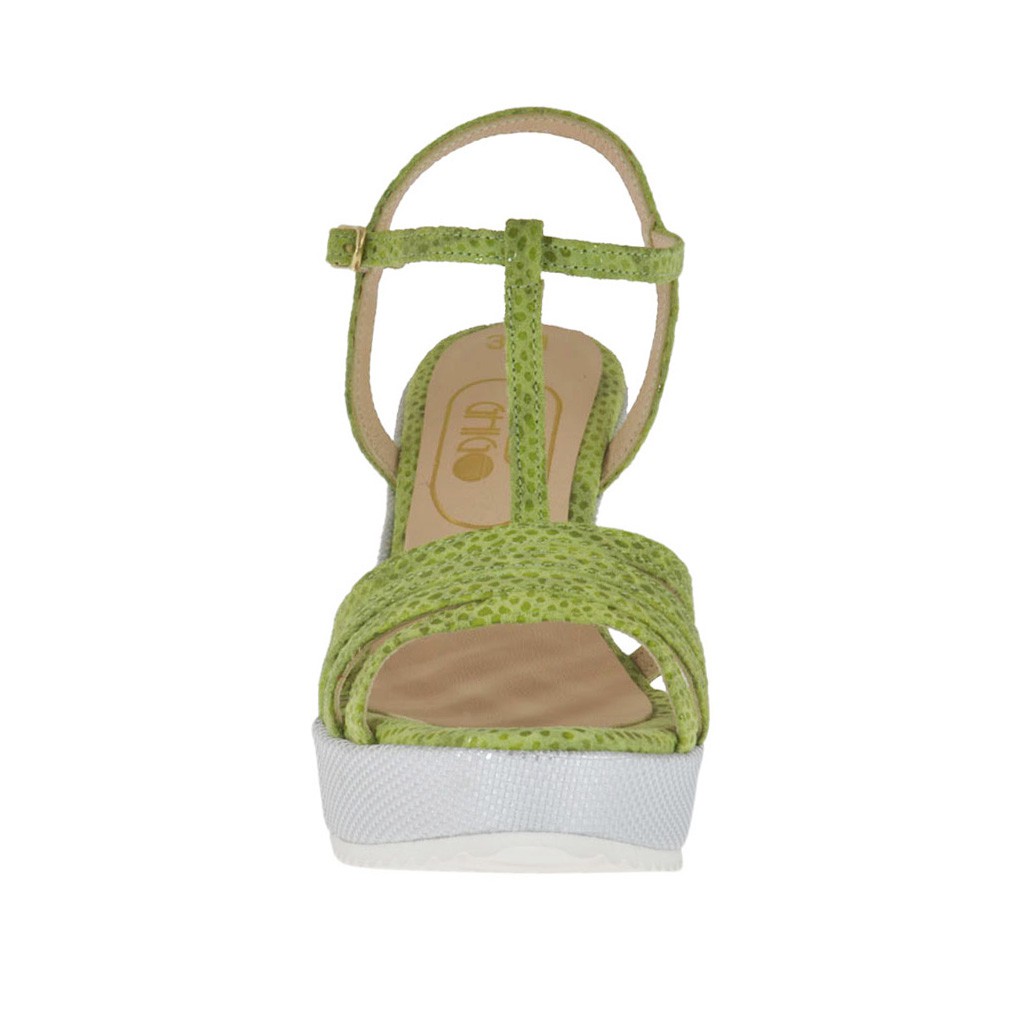 Sandale pour femmes avec courroie salomé, plateforme et talon compensé, 8cm. haut talon compensé et 3cm. haut plateforme, en daim imprimé verni vert et tissu lamé argent, semelle en caoutchouc, doublure en cuir. Disponible dans les petites pointures.