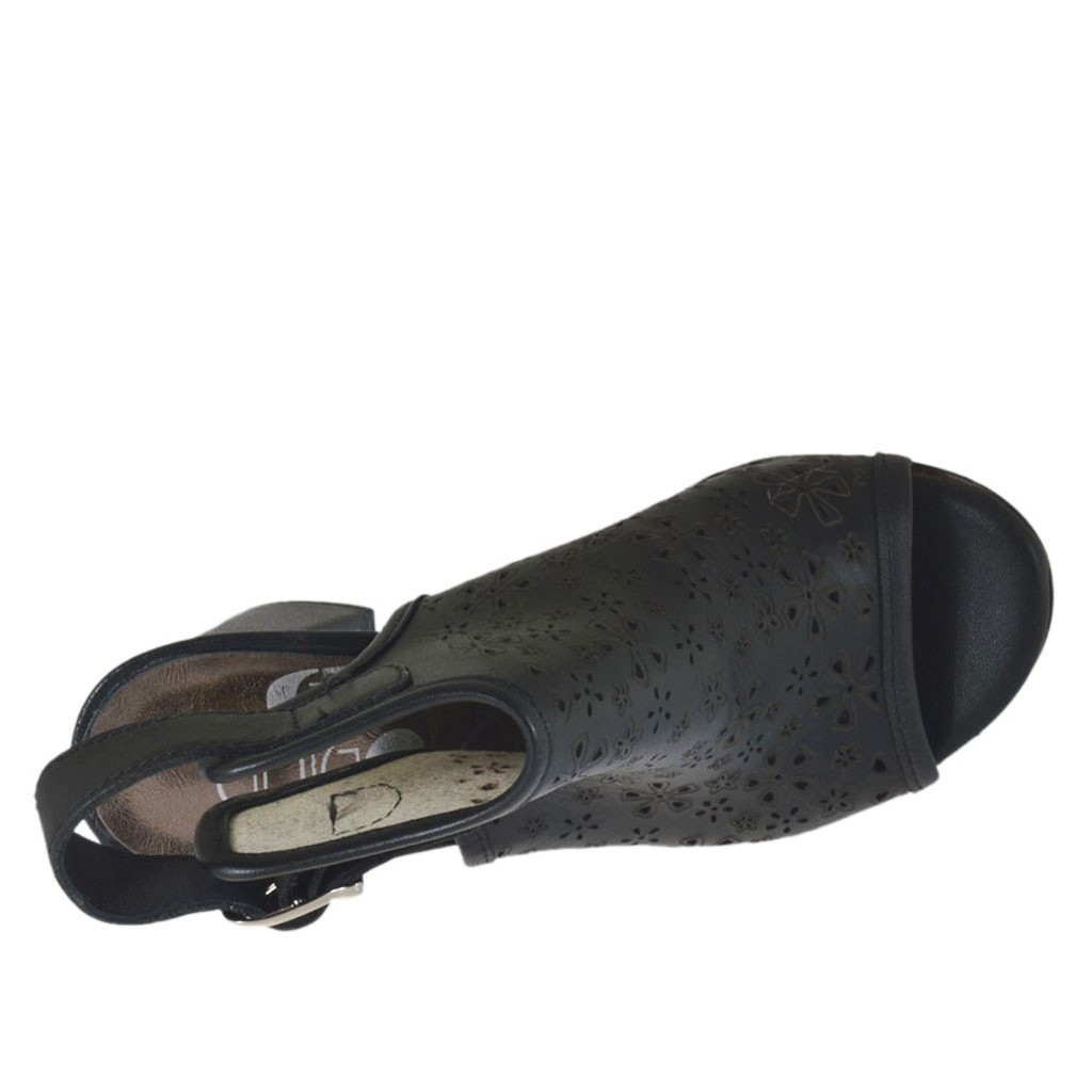 Sandale haute à la cheville pour femmes, 7 cm. haut talon, en cuir perforé noir, semelle en cuir, doublure en cuir. Disponible dans les petites et grandes pointures.