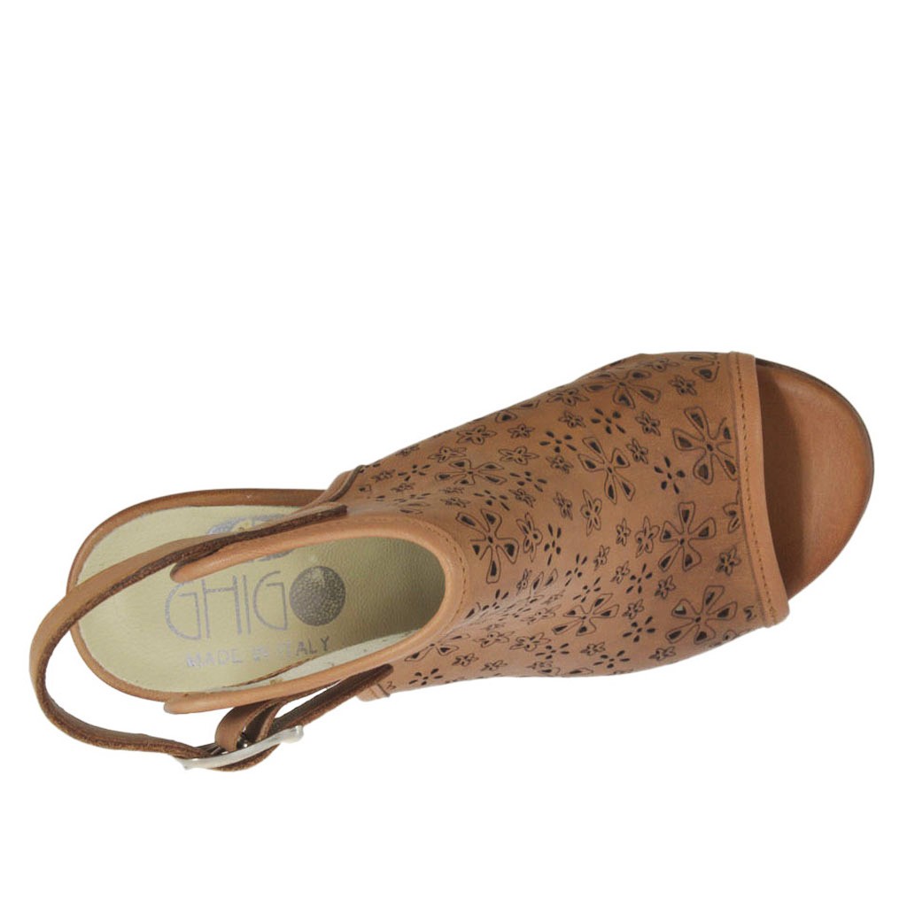Sandale haute à la cheville pour femmes, 7 cm. haut talon, en cuir perforé brun clair, semelle en cuir, doublure en cuir. Disponible dans les petites et grandes pointures.