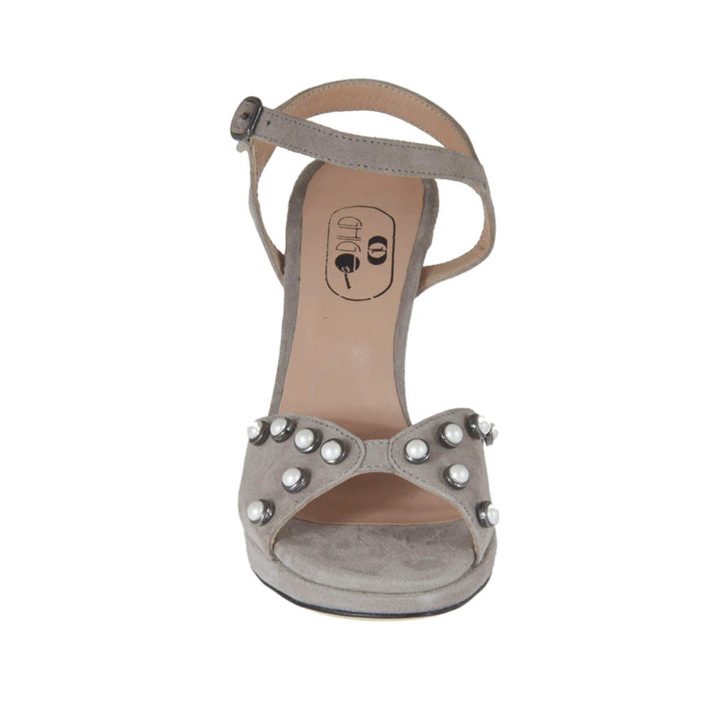 Sandale pour femmes avec plateforme, courroie et perles, 10cm. haut talon avec 1cm de plateforme, en daim gris, semelle en cuir, doublure en cuir. Disponible dans les petites et grandes pointures.