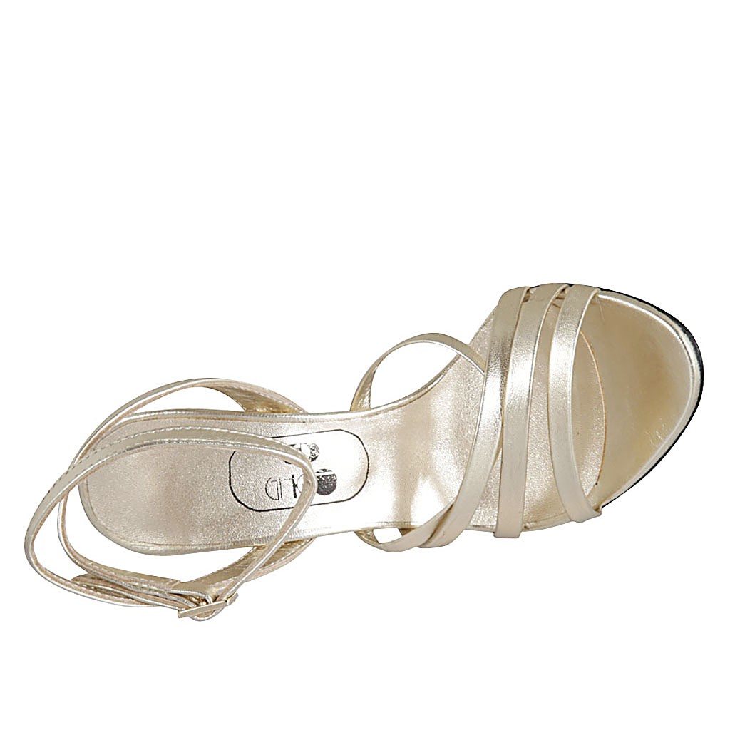 Sandale pour femmes avec courroie à la cheville en cuir lamé platine talon 9