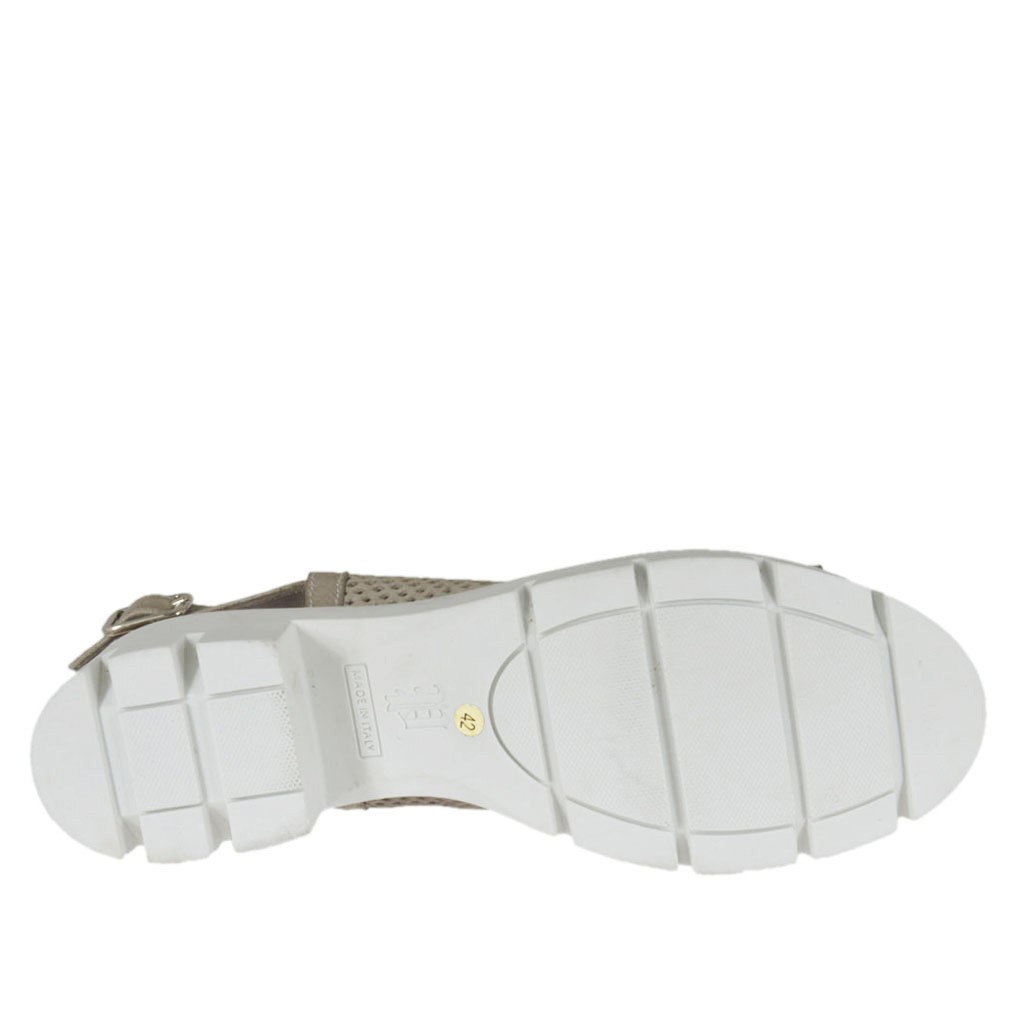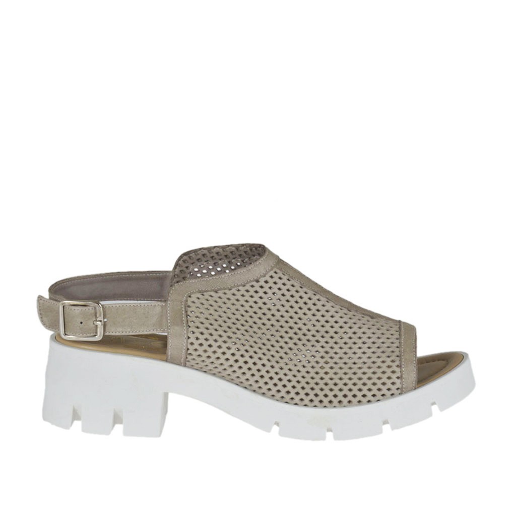 Sandalo accollato da donna, altezza tacco cm. 5, in pelle forata colore taupe, fondo gomma, fodera pelle. Disponibile nelle misure grandi.