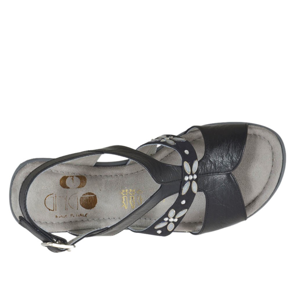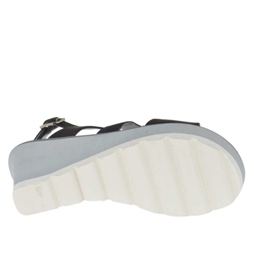 Sandalo da donna con strass, altezza zeppa cm. 6 e plateau di 2cm, in pelle e nabuk nero, fondo gomma, fodera pelle. Disponibile sia nelle taglie piccole che nei numeri grandi.