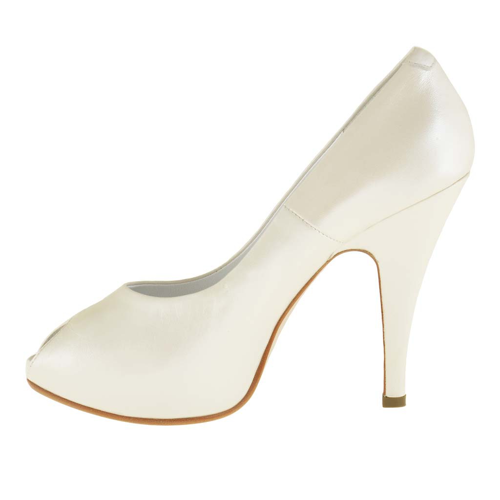 Scarpa da donna decoltè aperta in punta con plateau interno, altezza tacco cm. 10 cm.2 di plateau interno, in pelle perlata colore avorio, fondo cuoio, fodera pelle, disponibile sia nei numeri piccoli che nelle taglie grandi.