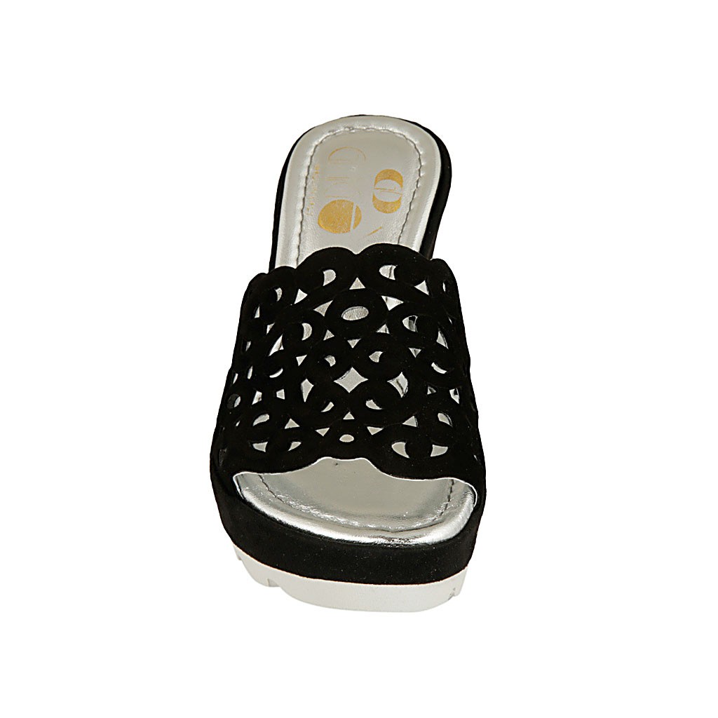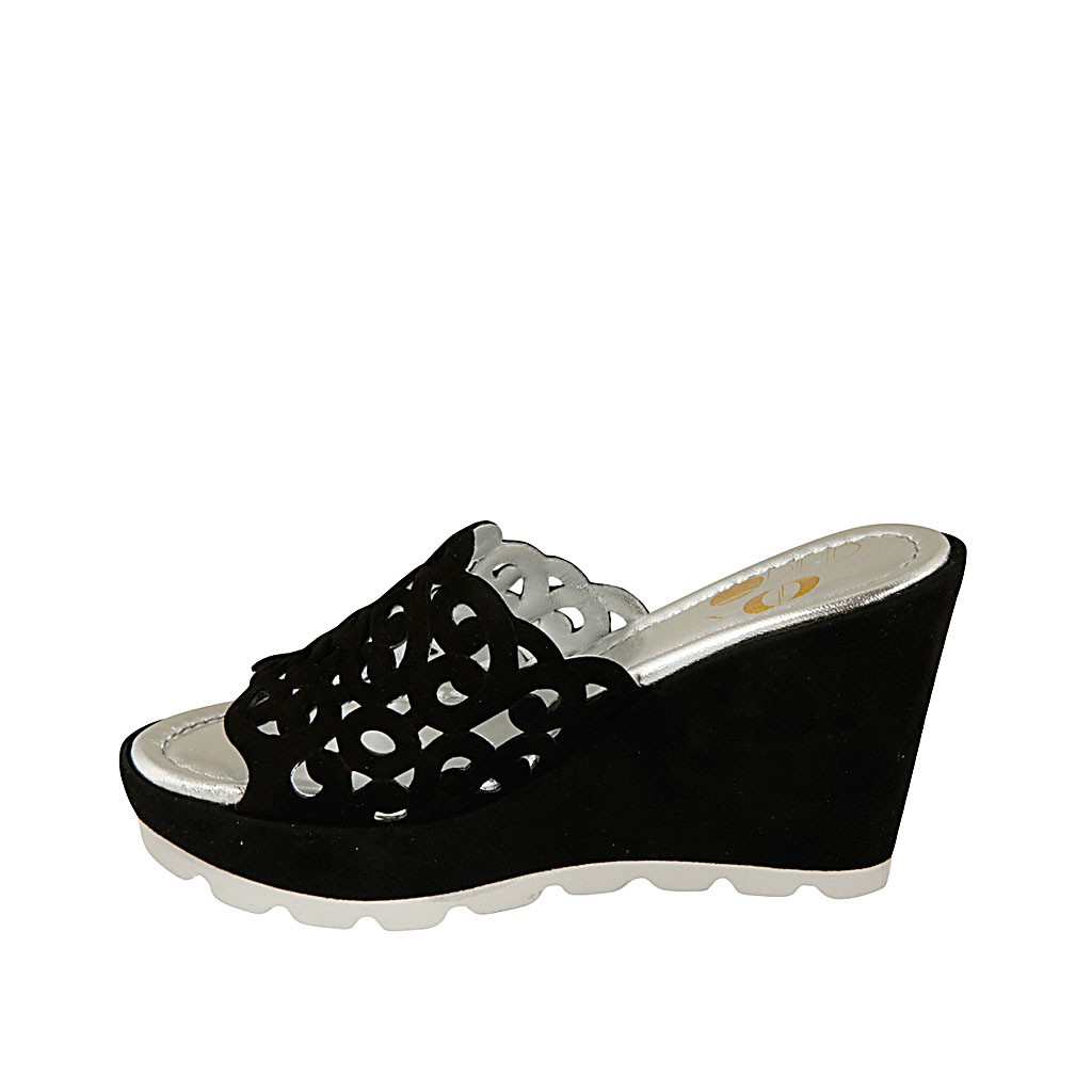 Sabot aperto da donna in camoscio forato nero con plateau e zeppa 9