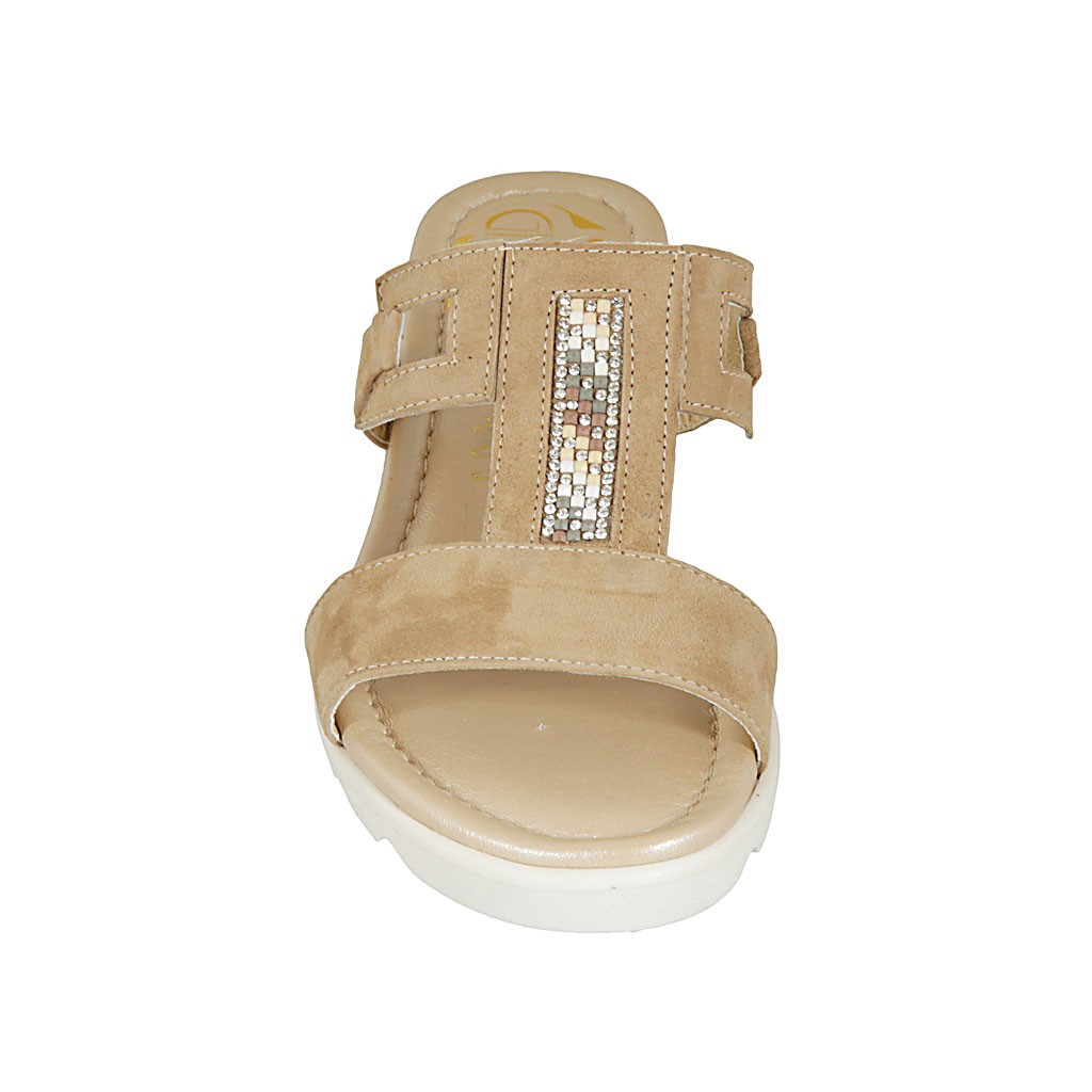 Questo modello particolare è fatto in camoscio chiaro con una leggera zeppa a tema rettile e un luminoso accessorio con strass.