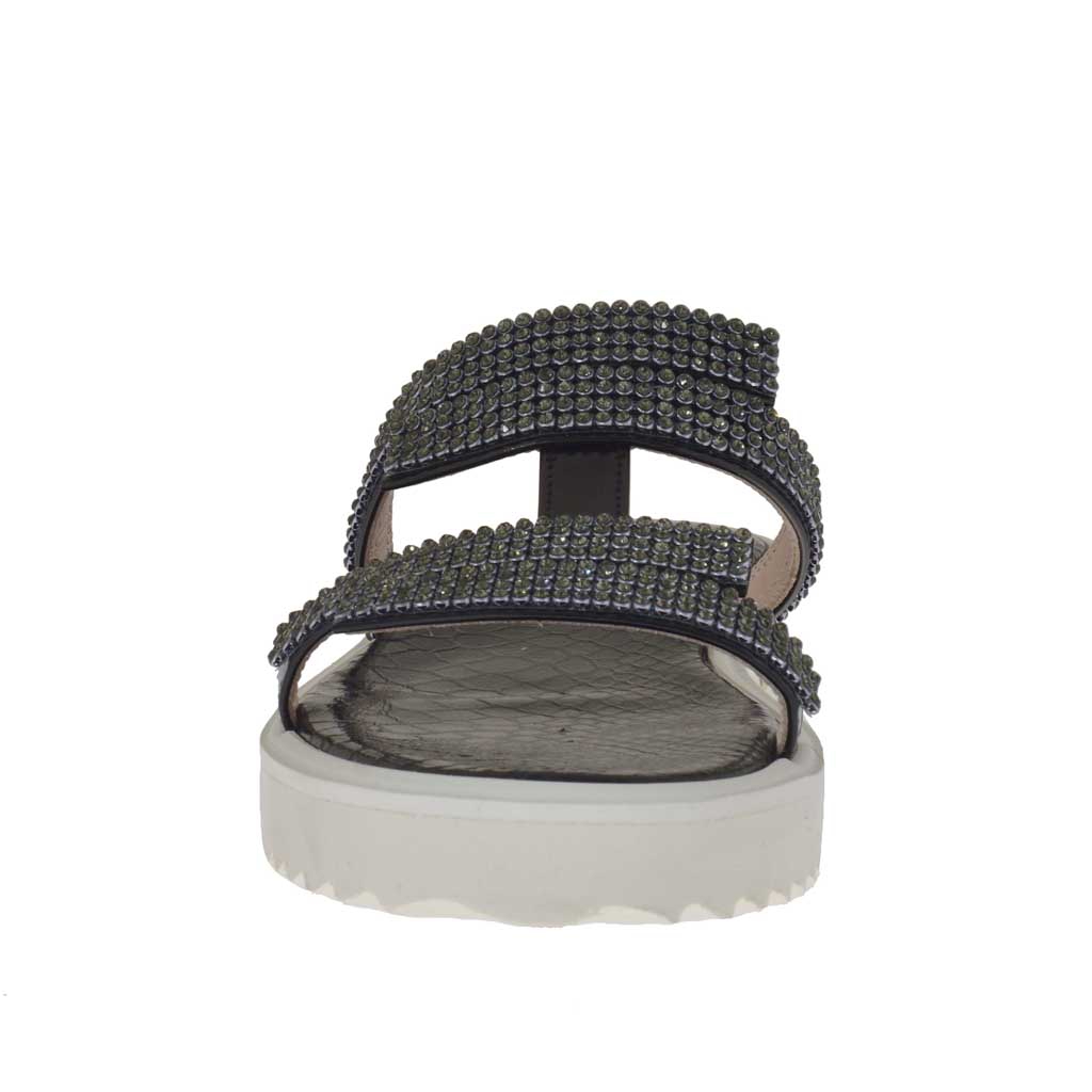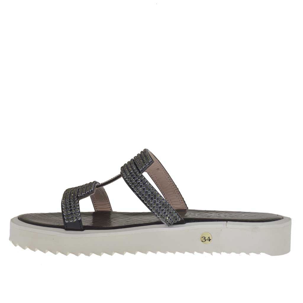 Sabot aperto da donna con strass, altezza zeppa cm. 2,5, in vernice nera, fondo gomma, fodera pelle. Disponibile sia nei numeri piccoli che nelle taglie grandi.