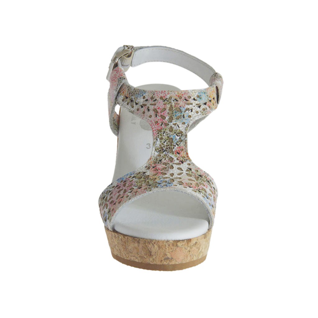 Sandalo da donna con zeppa e plateau in sughero, altezza zeppa cm.8 e plateau cm.2, in pelle forata stampata floreale multicolore, fondo gomma, fodera pelle. Disponibile sia nei numeri piccoli che nelle taglie grandi.