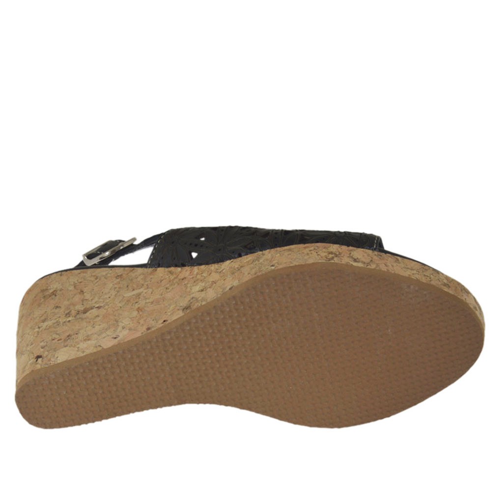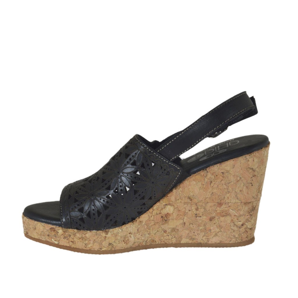 Sandalo da donna, altezza zeppa cm.8 e plateau cm.2 in sughero, in pelle forata nera, fondo gomma, fodera pelle. Disponibile sia nei numeri piccoli che nelle taglie grandi.