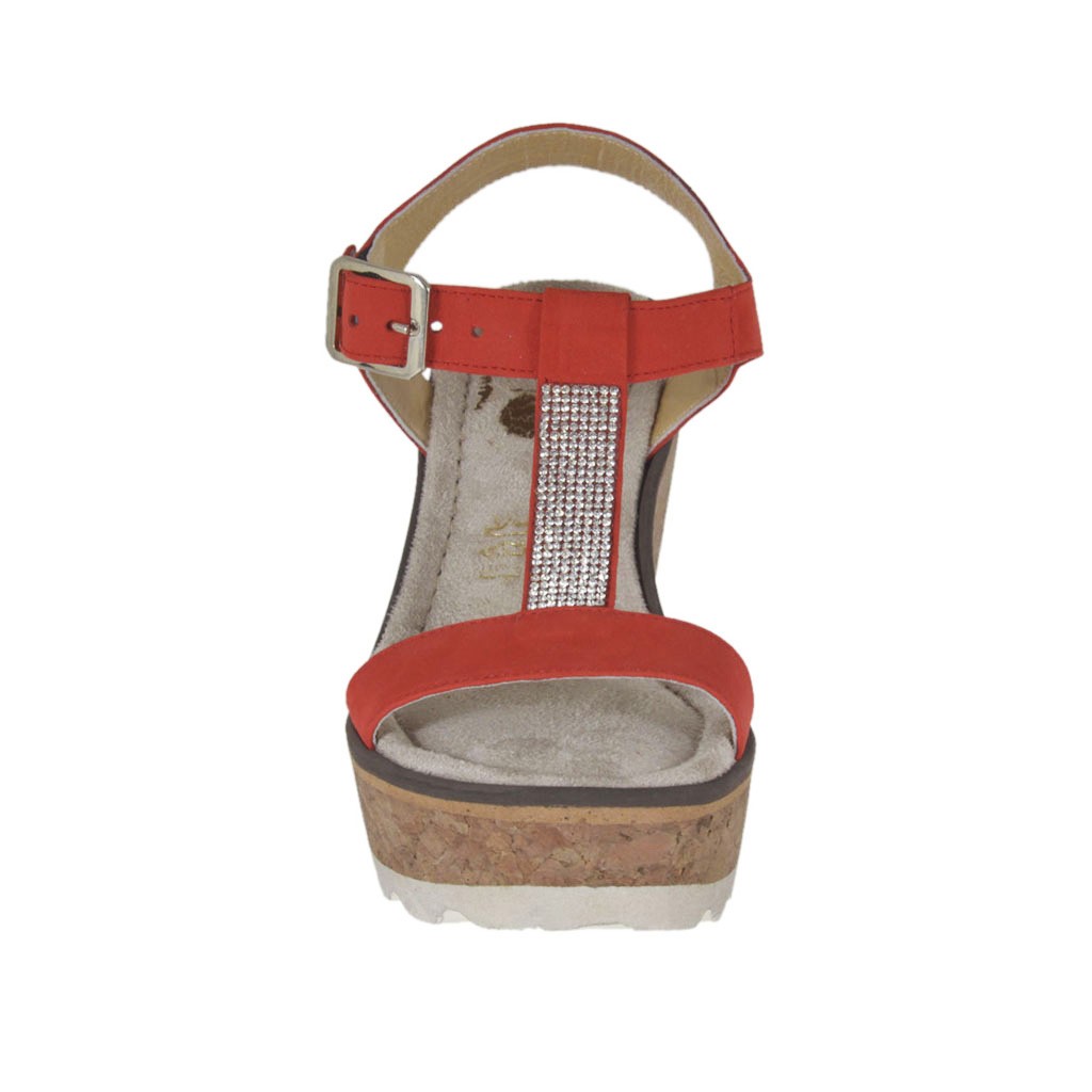 Sandalo da donna con cinturino, strass e plateau e zeppa in sughero, altezza zeppa cm. 8 e plateau di 2cm, in nabuk rosso, fondo gomma, fodera pelle. Disponibile sia nelle taglie piccole che nei numeri grandi.