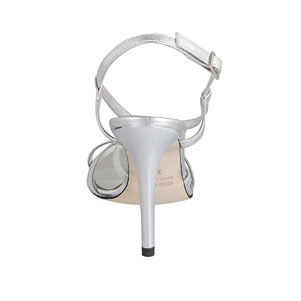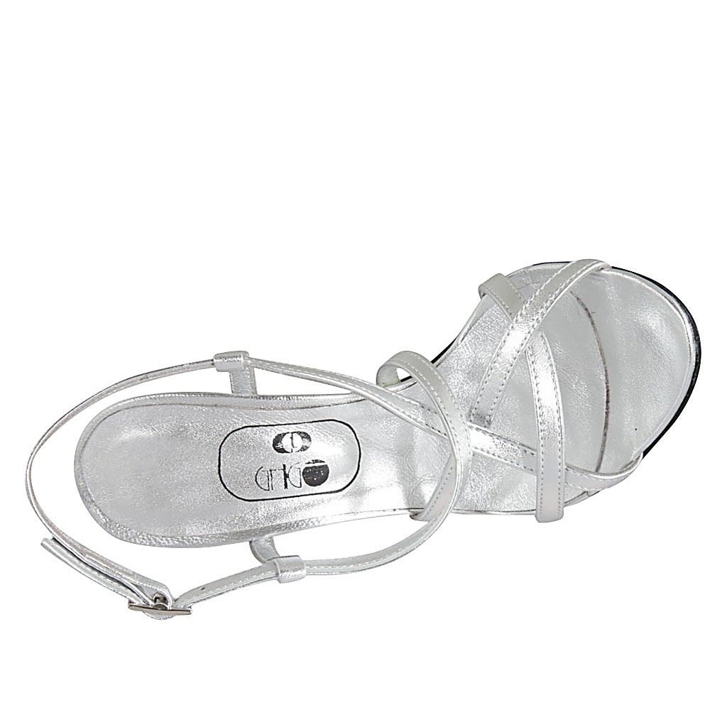 Sandalo da donna con listini incrociati in pelle laminata argento tacco 9