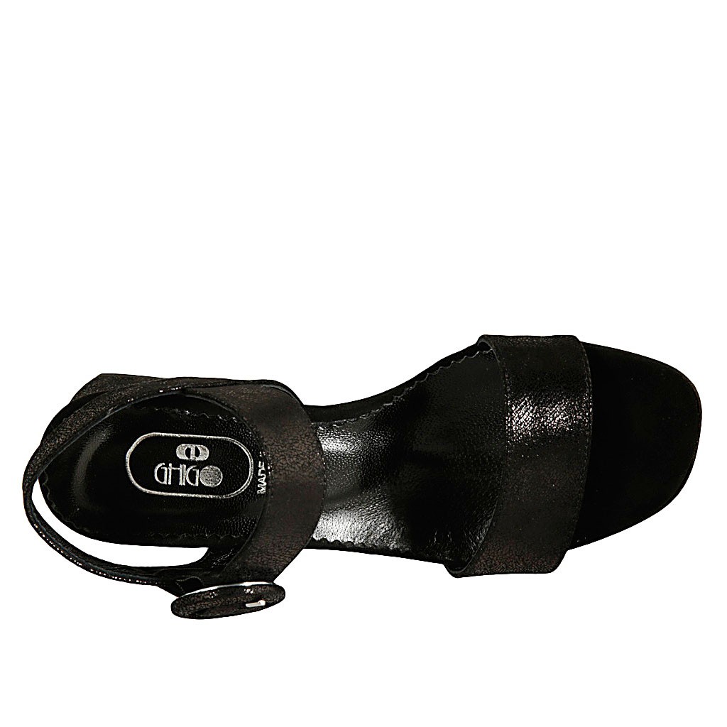 Sandalo da donna con cinturino in camoscio laminato stampato nero tacco 5