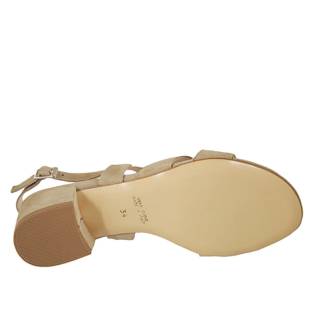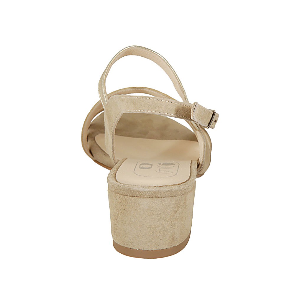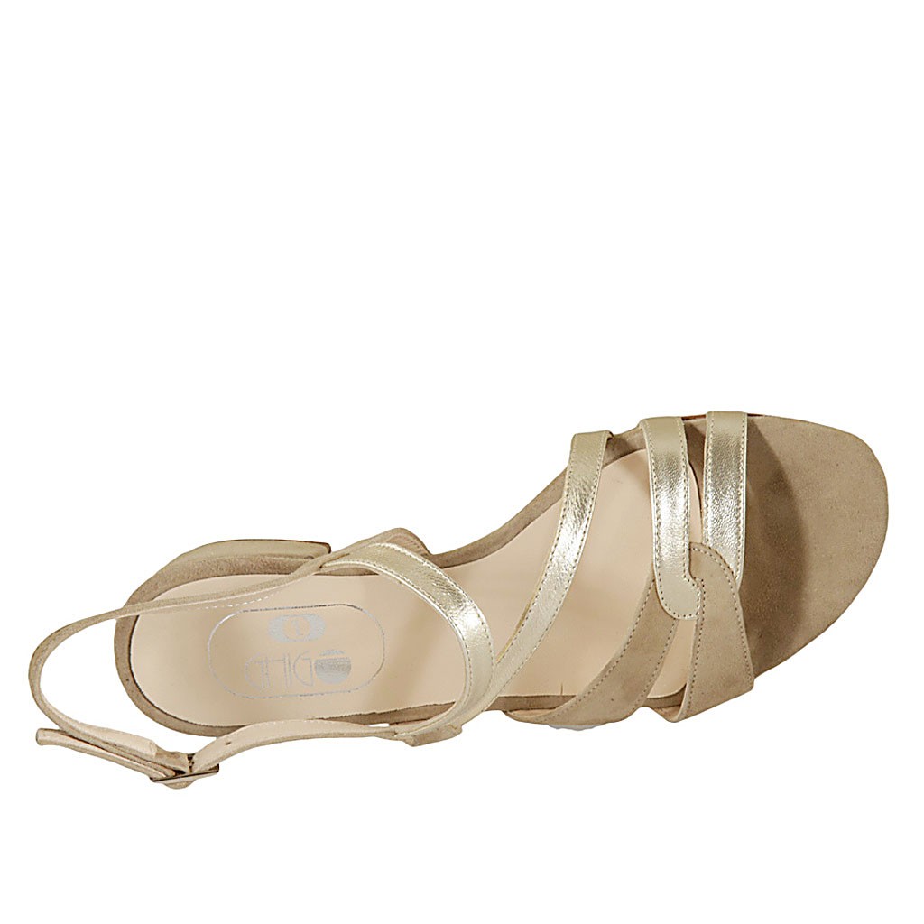 Sandalo da donna in pelle laminata platino e camoscio beige tacco 4