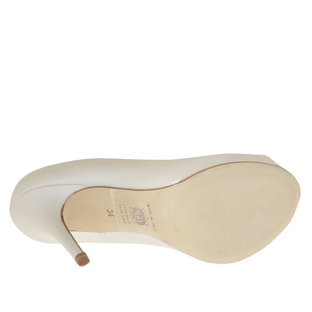 Decolté da donna aperta in punta, altezza tacco cm.11 con 1cm di plateau interno, in pelle avorio perlato, fondo cuoio, fodera pelle. Disponibile nelle misure piccole e grandi.