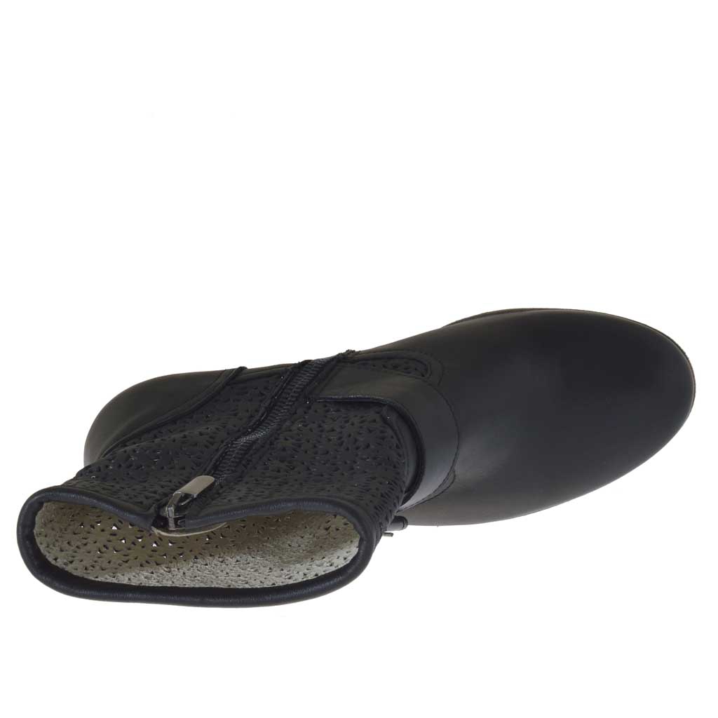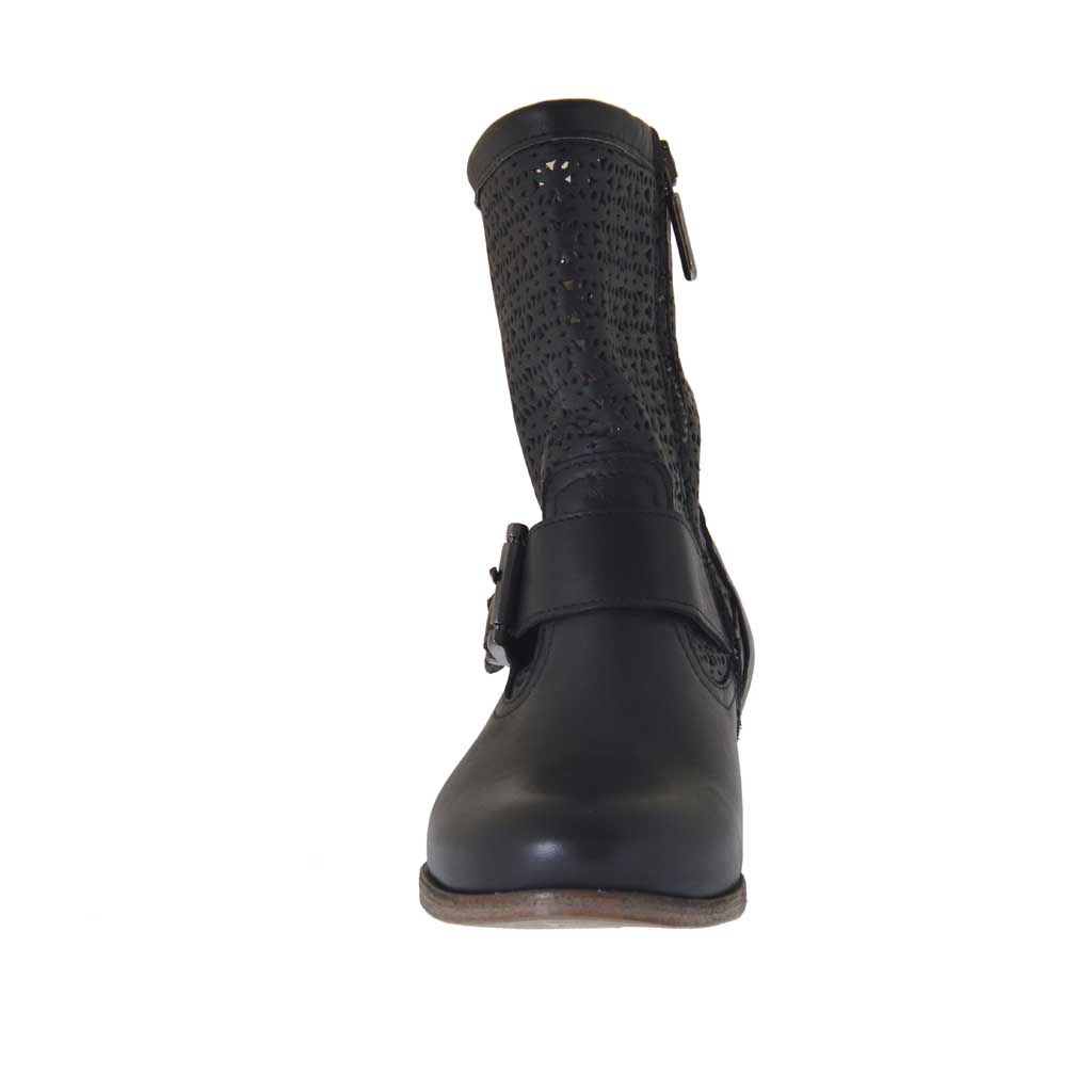 Stivaletto da donna con fibbia, altezza tacco cm. 2, in pelle forata nera, fondo cuoio, fodera pelle e tela. Disponibile sia nei numeri piccoli che nei numeri grandi.