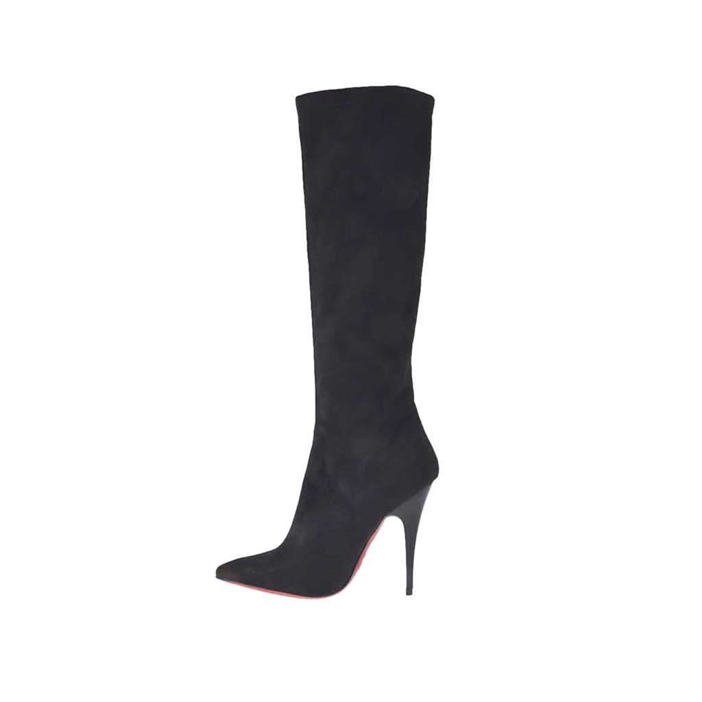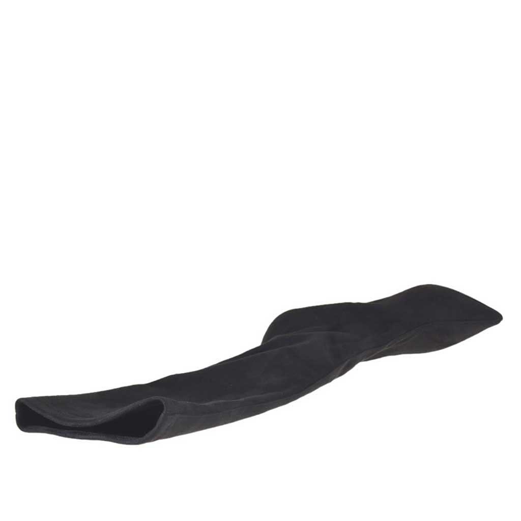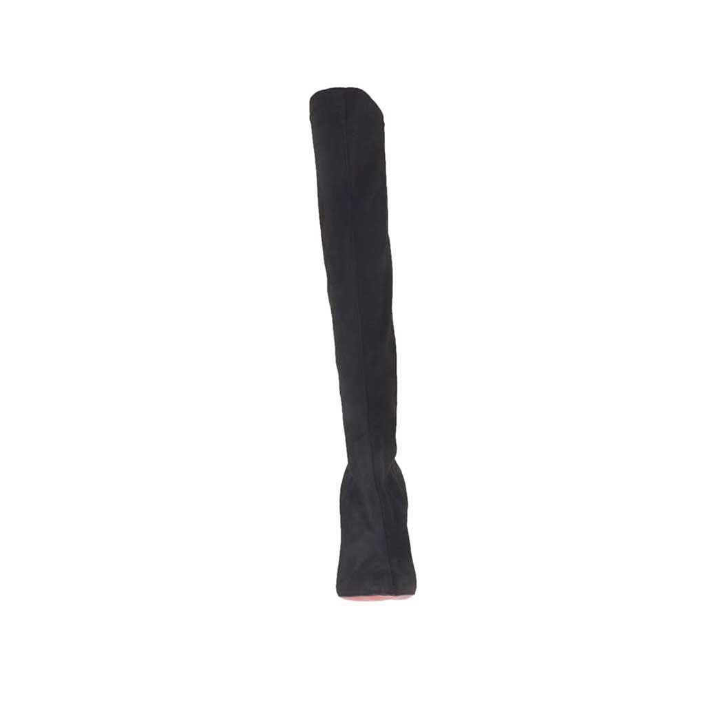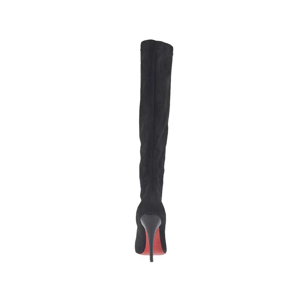 Stivale da donna, altezza tacco cm. 10, in camoscio ed elasticizzato nero, fondo cuoio, fodera pelle. Disponibile sia nelle misure piccole che nelle taglie grandi.