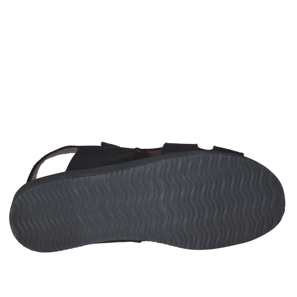 Sandalo da uomo con due fasce velcro, in nabuk colore nero, fondo gomma, fodera pelle. Disponibile nelle misure grandi.