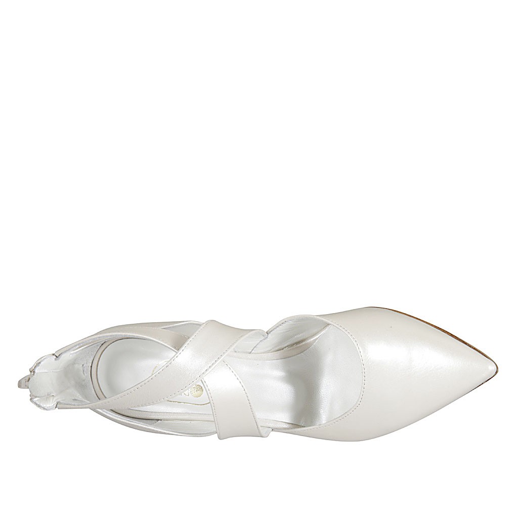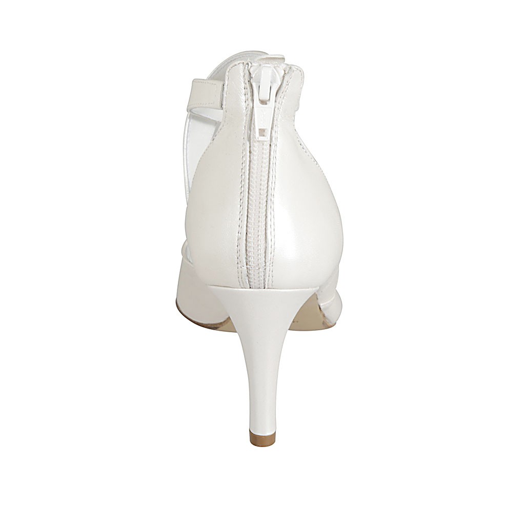 Woman's pump in pearled ivory leather with backside zipper and crossed straps heel 7