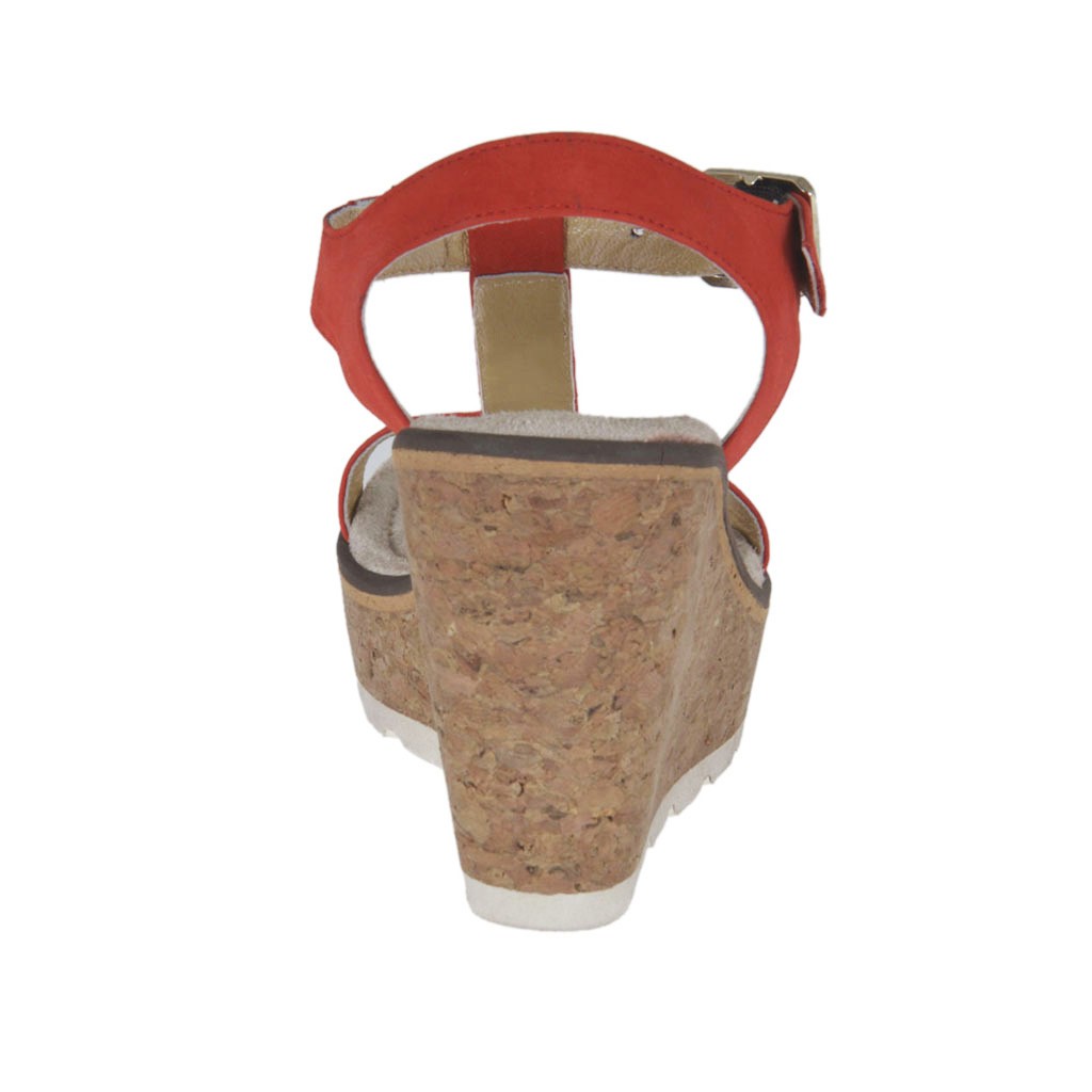 Woman's sandal with strap, rhinestones, cork platform and wedge, 8 cm. high wedge and 2 cm. high platform, in red nubuck leather, rubber sole, leather lining. Available in small and large sizes.