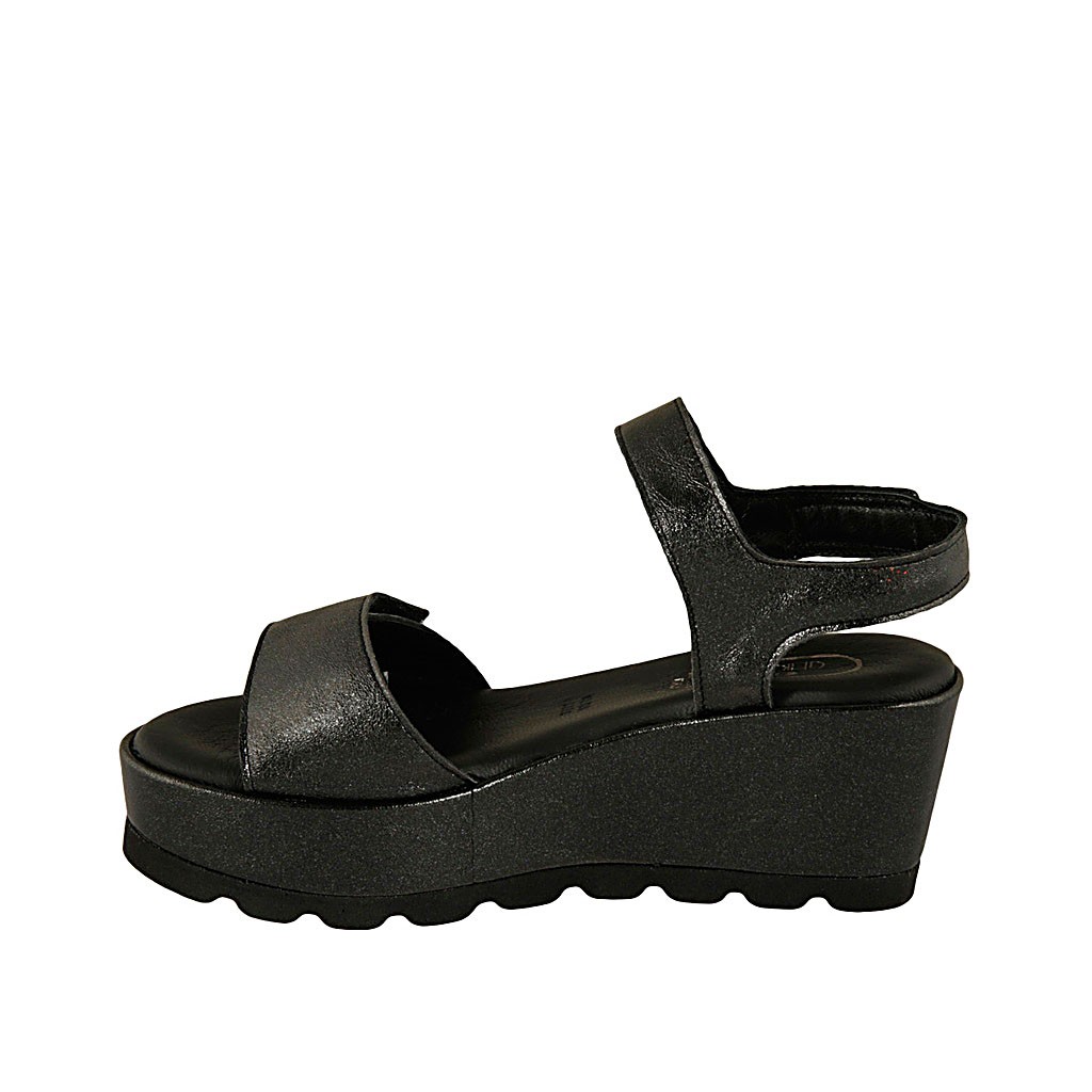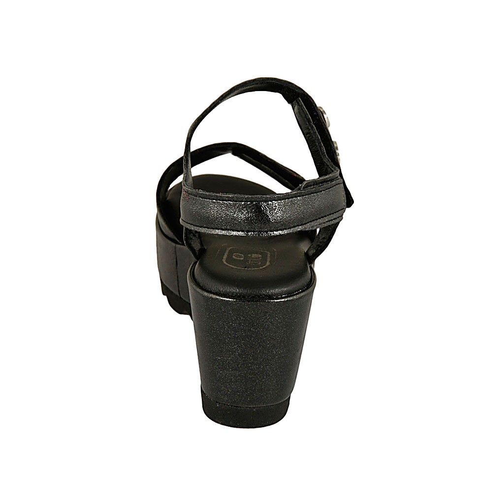 Sandalo da donna con velcro e borchie in pelle laminata nera zeppa 6