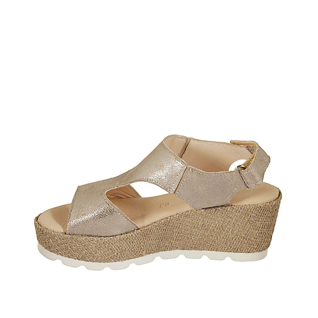 Woman's sandal in platinum laminated leather and fabric with velcro strap, platform and wedge 6